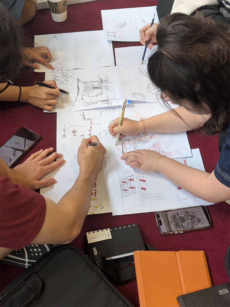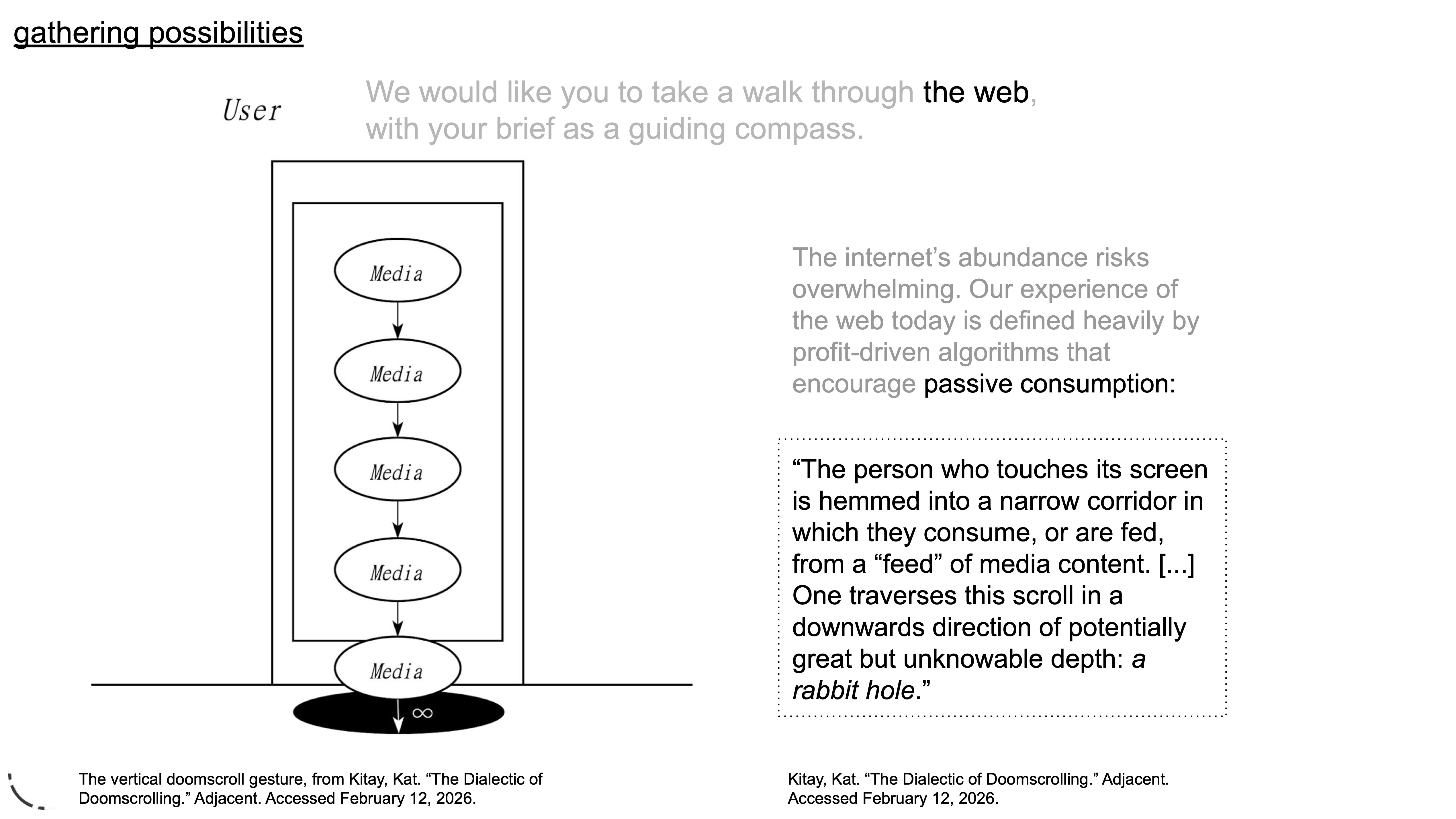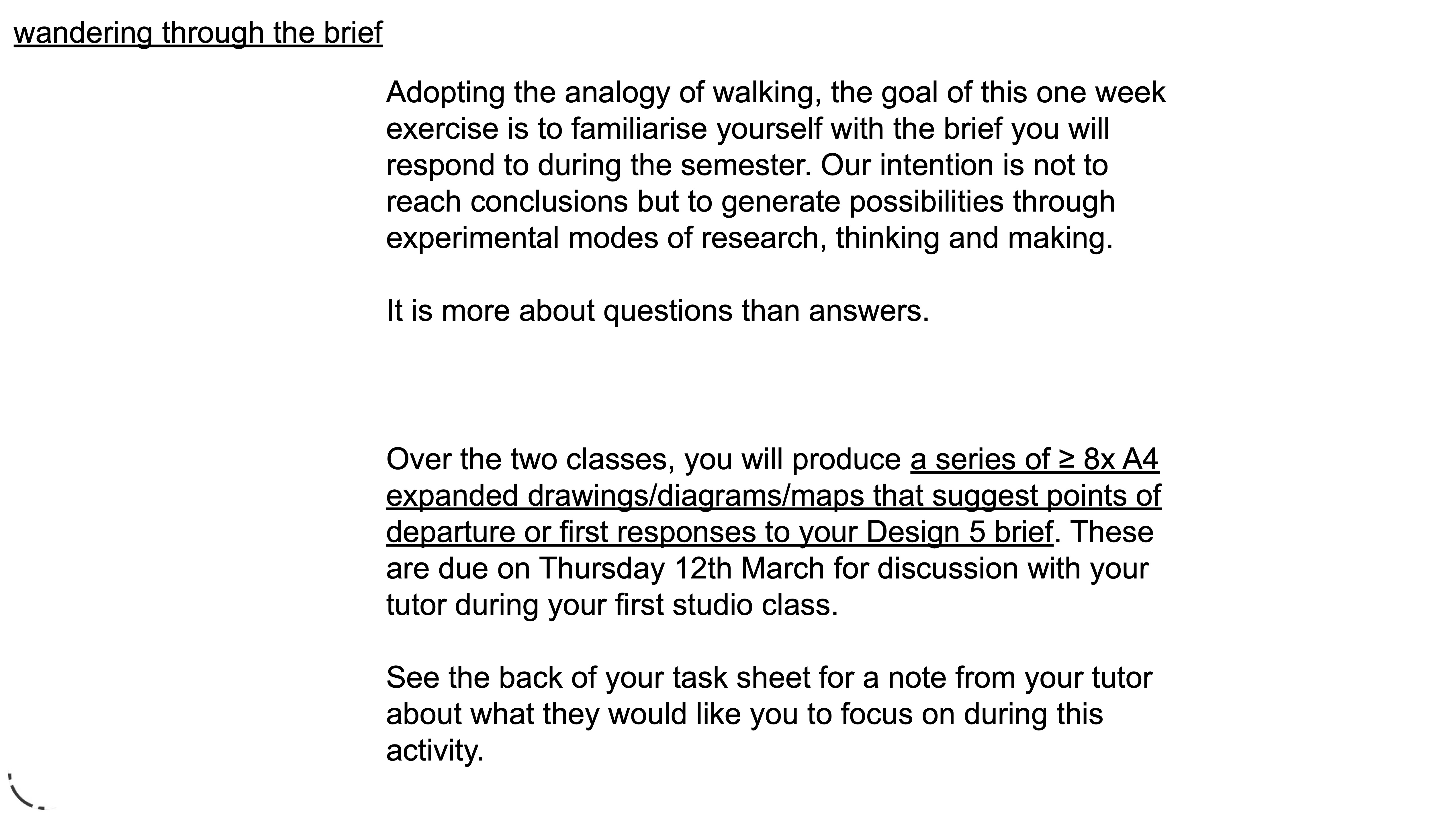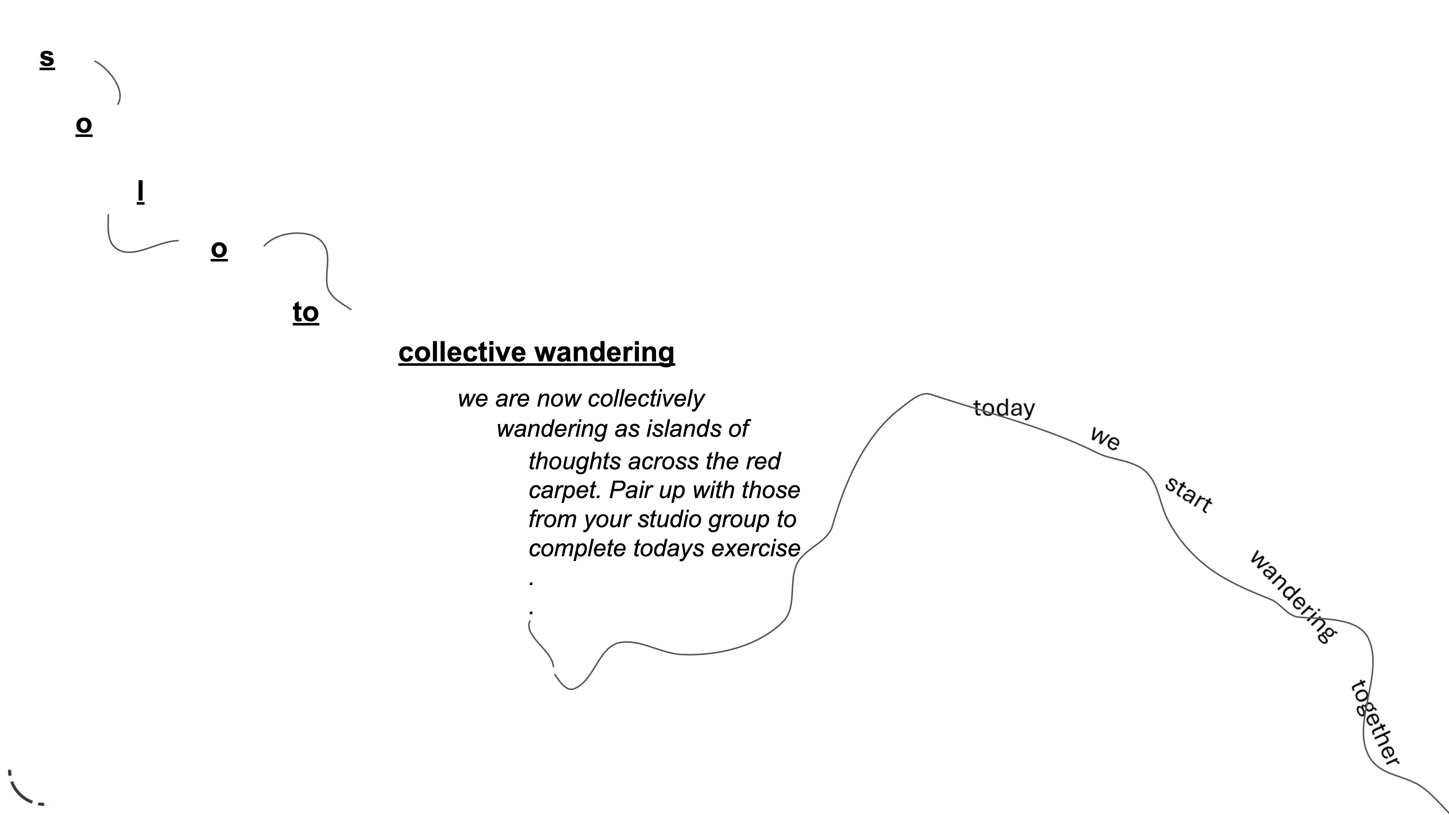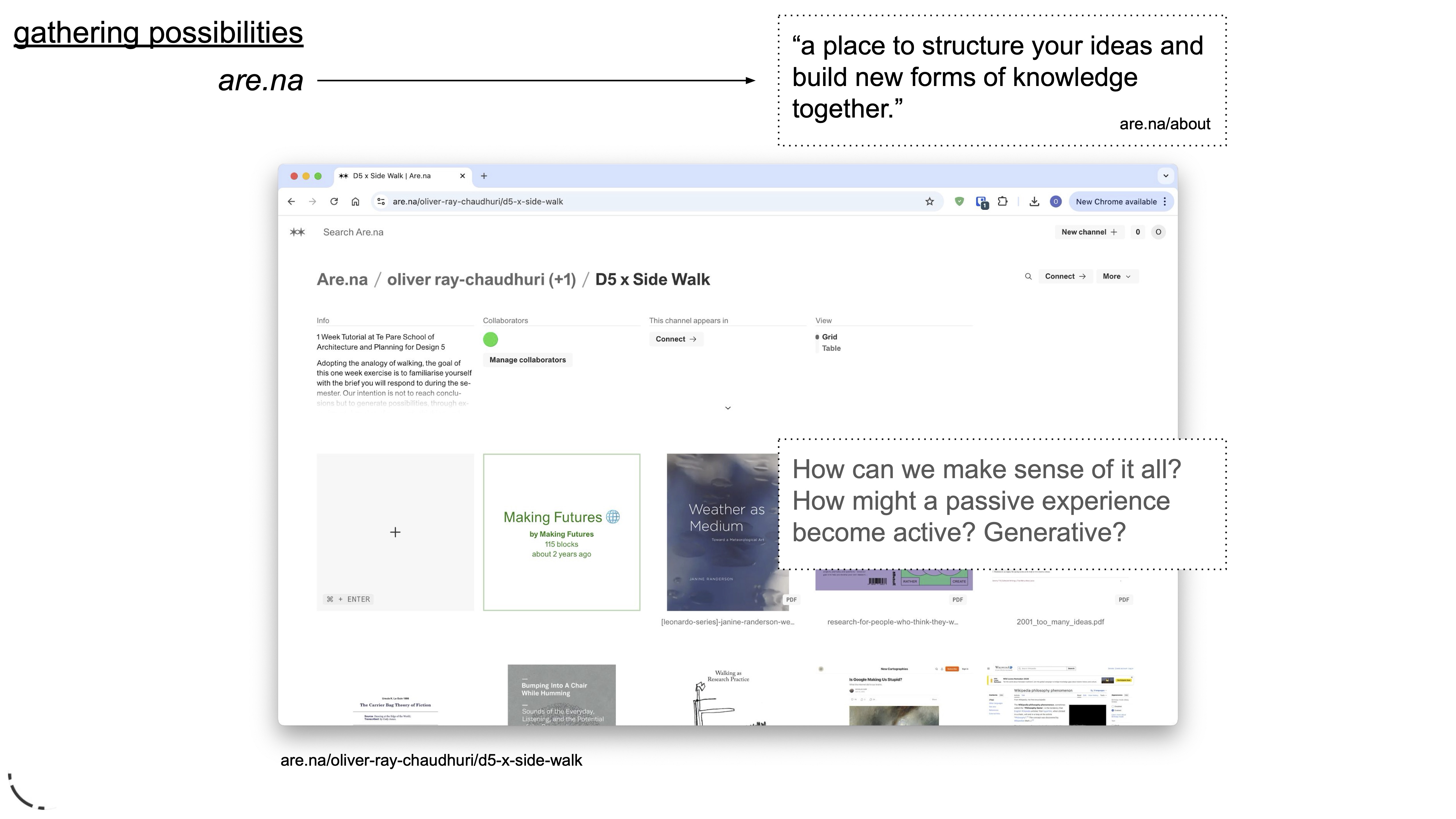 Adopting the analogy of walking, the goal of the exercise was for the students to familiarise themselves with the brief they would respond to during the semester. Our intention was not to reach conclusions but to generate possibilities, through experimental modes of research, thinking and making. Students used are.na to find and collect relevant resources and to make connections between similar ideas. They then used drawing, writing, diagramming and mapping to translate these ideas back into the world and assembled them collectively to generate new possibilities. |